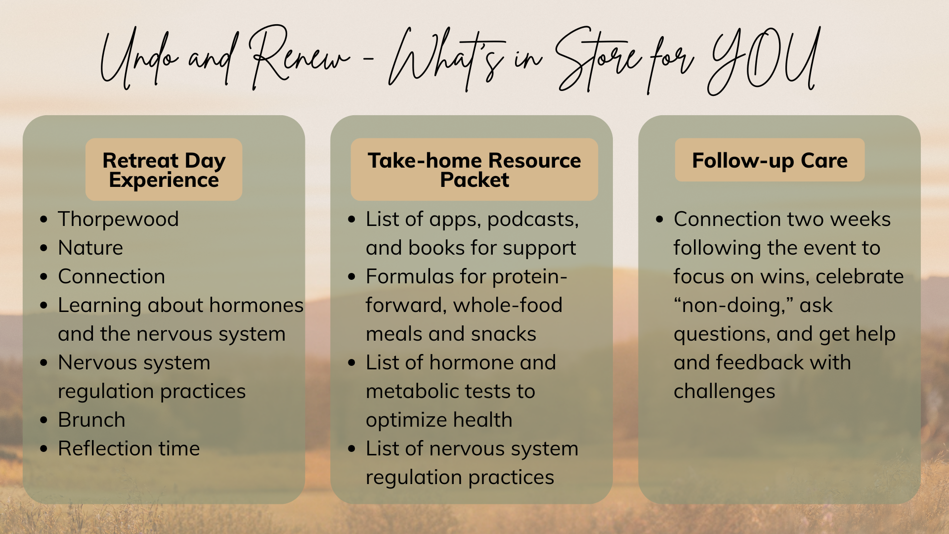 Take-home resources: We’ll cover a lot of information, practices, and resources during our in-person time together. We want you to be able to digest it all, so we’ve created packets for you to take home that include the slides we cover, reminders of the practices we move through, resources (e.g., apps, podcasts, etc.) hormone and nervous system health, and easy food templates for protein-forward, whole-food meals and snacks.